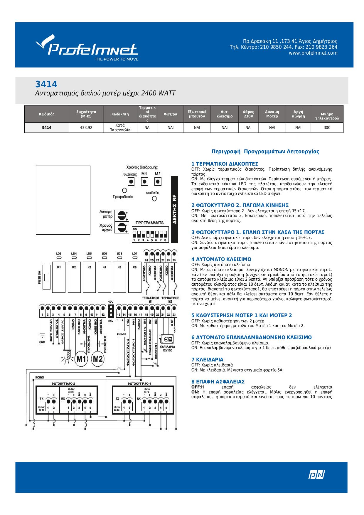Κιτ μοτέρ αυλόπορτας PROFELMNET PRL-09D για ανοιγόμενες πόρτες 2 φύλλων με βάρος έως 200kg. Η εγκατάστασή του είναι εύκολη και γρήγορη παρέχοντας μέγιστη ασφάλεια και αξιοπιστία στον χρόνο και την συχνή χρήση. Είναι μια πρακτική λύση που διευκολύνει την καθημερινότητά σας και προστατεύει από πιθανούς εισβολείς και παραβιάσεις στον χώρο σας. To κιτ περιλαμβάνει μοτέρ, 1 τηλεχειριστήριο.