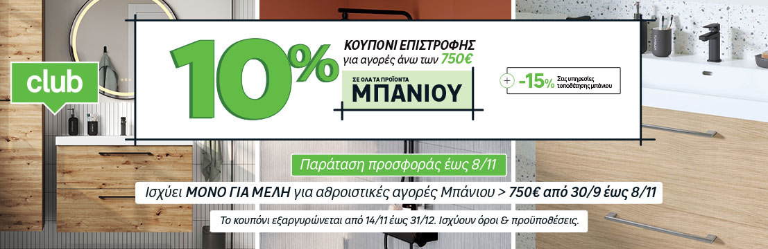 Tα μέλη του club λαμβάνουν την 14/11/2025 κουπόνι επιστροφής με το 10% της τελικής πληρωτέας αξίας των ειδών μπάνιου του συνόλου των αγορών τους στο κατάστημα ή/ και στο www.leroymerlin.gr (μετά από τυχόν εκπτώσεις, κουπόνια ή προσφορές).