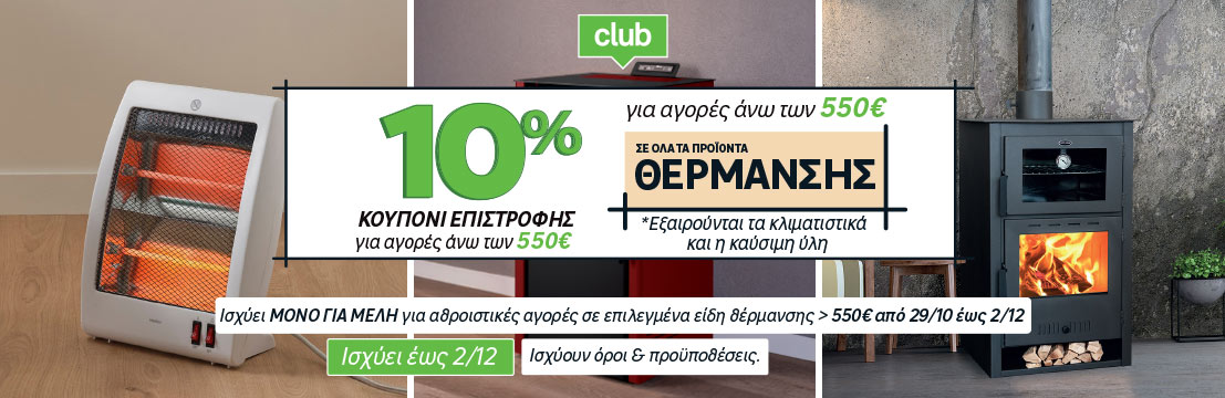 Τι κερδίζω από την ενέργεια;Τα μέλη του LEROY MERLIN club λαμβάνουν στις 04/12/2025 κουπόνι επιστροφής αξίας 10% της τελικής πληρωτέας αξίας των αγορών τους σε προϊόντα και σχετικές υπηρεσίες θέρμανσης/ψύξης
