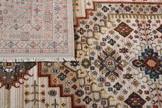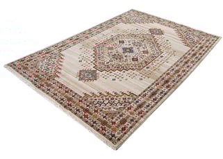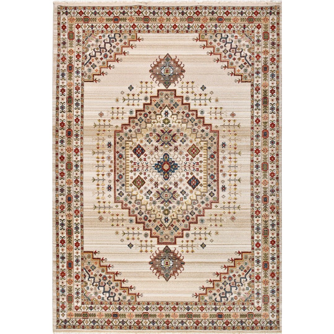 Χαλί μηχανής από την συλλογή Oriental σε μπεζ απόχρωση με πολύχρωμο έθνικ σχέδιο. Η σειρά Oriental αποτελείται από χαλιά σε boho στυλ και κλασικά γεωμετρικά σχέδια με ζεστά χρώματα. Kατασκευασμένο με ανεξίτηλα νήματα σύνθεσης από 100% soft heatset πολυπροπυλένιο και βαμβάκι. Έχει βάρος 2.300gr/m2 και πυκνότητα 256.000 κόμπους/m2. Το παχύ πέλος ύψους 12mm σας προσφέρει μία ευχάριστη αίσθηση στο πάτημα και στο τελείωμα έχει φυσικό βαμβακερό κρόσσι. Διαθέτει βαμβακερό υπόστρωμα αυξάνοντας την αντοχή και τη διάρκεια ζωής του χαλιού. Αντιβακτηριδιακά, υποαλλεργικά και με αντιστατικά νήματα, επομένως δεν μαγνητίζονται χνούδια, μικροσωματίδια και σκόνη στην επιφάνειά τους. Τα νήματα που χρησιμοποιούνται και η διαδικασία παραγωγής των χαλιών είναι πιστοποιημένα με όλα τα διεθνή σήματα ποιότητας. Tο σκούπισμα με ηλεκτρική σκούπα είναι εύκολο. Ο καθαρισμός του χαλιού είναι εύκολος, καθώς είναι πλενόμενο σύμφωνα πάντα με τις οδηγίες του προμηθευτή. Τα χαλιά Oriental είναι ιδανικά για όλους τους χώρους του σπιτιού και αναβαθμίζουν την αισθητική του χώρου με μία boho πινελιά.