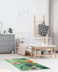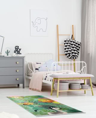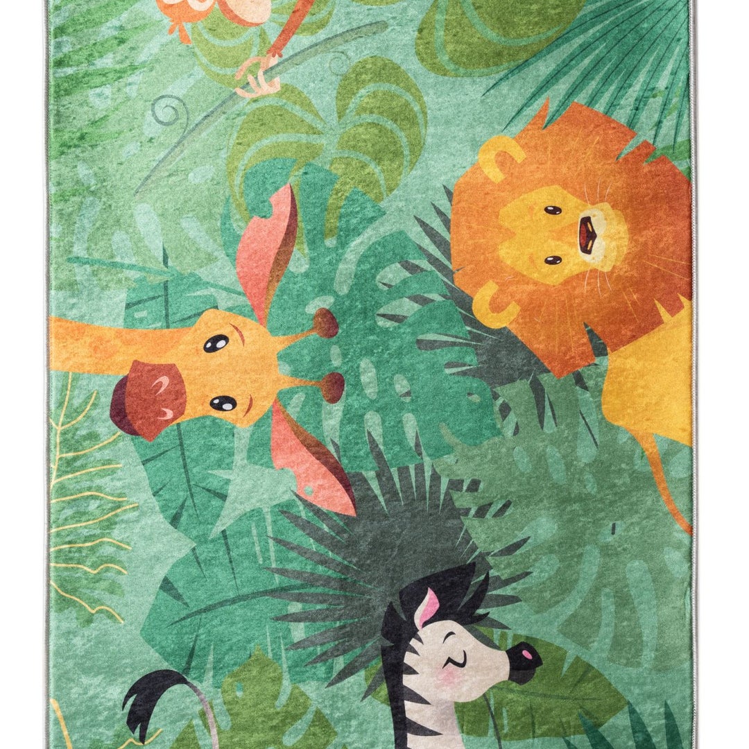 Χαλί μηχανής Jungle από πολυεστέρα σε πράσινο χρώμα και σχέδιο με ζώα της ζούγκλας. Μία πρακτική και καλαίσθητη προσθήκη στο παιδικό υπνοδωμάτιο, αυτό το χαλί είναι ένας εξαιρετικός τρόπος για να προστατεύσετε το δάπεδό σας από φθορές και ζημιές, καθώς και να παρέχετε ευχάριστη θερμομόνωση και ηχομόνωση κάνοντας την καθημερινή χρήση του δωματίου πιο ευχάριστη. Κατασκευασμένο από ίνες πολυεστέρα είναι ανθεκτικό στην καταπόνηση από το πάτημα και το τέντωμα. Με αντιολισθητική επένδυση στο πίσω μέρος, η οποία εμποδίζει το χαλί να κυλάει και να γλιστράει. Το κοντό πέλος καθαρίζεται εύκολα και αποτρέπει τη συσσώρευση σκόνης, ενώ το τακτικό σκούπισμα με ηλεκτρική σκούπα και η άμεση απομάκρυνση τυχόν βρωμιάς είναι επαρκή για να διατηρήσει τη φρέσκια και αισθητική του εμφάνιση για μεγάλο χρονικό διάστημα. Η επιφάνεια του χαλιού είναι απαλή και ευχάριστη στην αφή, φέρνοντας μια αίσθηση άνεσης και μια ζεστή ατμόσφαιρα στο δωμάτιο. Το χαλί Jungle θα ολοκληρώσει όμορφα τη σύνθεση του παιδικού δωματίου. Είναι επίσης μια τέλεια λύση αν θέλετε να δημιουργήσετε μια γωνιά παιχνιδιού ή έναν χώρο χα