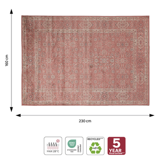 Το ορθογώνιο χαλί εσωτερικού χώρου ABELIE από την INSPIRE είναι ιδανικό για να προσθέσετε μια κομψή πινελιά στη διακόσμησή σας. Το ανατολίτικης έμπνευσης σχέδιό του και το ροζ χρώμα PANTAI 4 θα συμπληρώσουν τέλεια έναν ρουστίκ εσωτερικό χώρο. Είναι ιδανικό για χρήση σε σαλόνι ή υπνοδωμάτιο, κάτω από ένα κρεβάτι. Το πολύ απαλό υλικό του το καθιστά εύκολο στη διαχείριση: είναι πολύ εύκολο να διπλωθεί και να αποθηκευτεί. Επιπλέον, το σατινέ φινίρισμα και το ελαφρώς ξεθωριασμένο σχέδιό του του δίνουν μια μοντέρνα πινελιά. Φροντίστε τον εαυτό σας και την οικογένειά σας: Αυτό το προϊόν είναι πιστοποιημένο STANDARD 100 από την Oeko-Tex®, που εγγυάται ότι δεν περιέχει επιβλαβείς ουσίες σε ποσότητες που θα μπορούσαν να είναι επιβλαβείς για την υγεία σας. Διαστάσεις: 160 x 230 cm (πλάτος x μήκος).