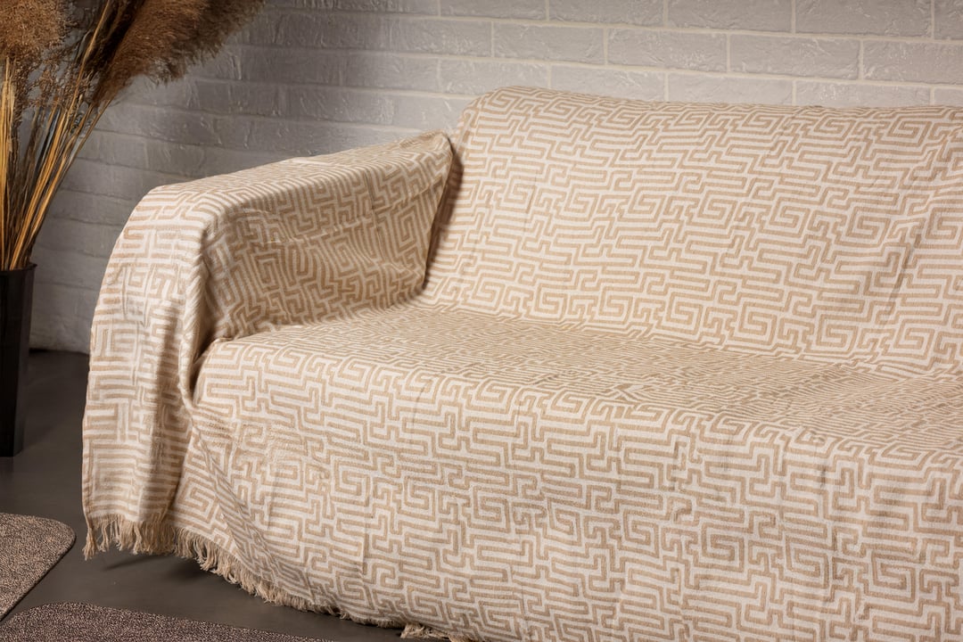 Ριχτάρι με κρόσσια από βαμβάκι και polyester κίτρινο, σε γεωμετρικό σχέδιο Μαίανδρος, σε μπεζ χρώμα. Το ριχτάρι Μαίανδρος είναι ιδανικό για τη διακόσμηση και την προστασία ενός τριθέσιου καναπέ. Είναι κατασκευασμένο από 80% βαμβάκι και 20% πολυεστέρα, το οποίο είναι ανθεκτικό στον χρόνο και επιτρέπει στο ύφασμα να αναπνέει, χωρίς να συγκρατεί την υγρασία. Κατάλληλη επιλογή για όλους τους μήνες του έτους. Για την καλύτερη φροντίδα του, προτείνεται πλύση και σιδέρωμα σε χαμηλές θερμοκρασίες και δεν ενδείκνυται η χρήση χλωρίου ή λευκαντικού.