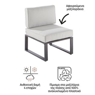 Πολυθρόνα κήπου Naterial Odyssea με κατασκευή από αλουμίνιο και κάθισμα και μαξιλάρι με αφαιρούμενα γκρι καλύμματα από πολυεστέρα και ύφασμα. Η πολυθρόνα κήπου Naterial Odyssea μπορεί να χρησιμοποιηθεί μόνη της ή σε συνδυασμό με το γωνιακό σαλόνι Odyssea ως επιπλέον κάθισμα επιτρέποντάς του να μεγεθύνεται κατά βούληση. Υψηλό επίπεδο άνεσης και ενισχυμένη από την παρουσία μαξιλαριών στην πλάτη και το κάθισμα. Κατασκευασμένα από πολυεστέρα, έχουν υποστεί μια αντι-UV και υδατοαπωθητική επεξεργασία, η οποία επιβραδύνει τον αποχρωματισμό τους και σας επιτρέπει να απορροφάτε αμέσως τους τυχαίους λεκέδες. Κατασκευασμένη από αλουμίνιο η πολυθρόνα Odyssea είναι ανθεκτική στις καιρικές συνθήκες, στη σκουριά και μπορεί να μετακινηθεί εύκολα. Ο σχεδιασμός του σε συνδυασμό με το ανθρακί χρώμα του φέρνουν μια μοντέρνα και φιλόξενη πινελιά στους εξωτερικούς σας χώρους. Οι καθαρές γραμμές και τα πόδια σε σχήμα U ενισχύουν το γεωμετρικό και μοντέρνο στυλ του συνόλου. Συνδυάστε το με το γωνιακό σαλόνι Odyssea για να φιλοξενήσετε άνετα τους καλεσμένους σας και με το Odyssea Pergola για τις πιο ηλιόλουστες μέρες.
