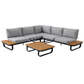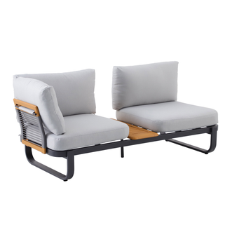 Γωνιακό σετ επίπλων εξωτερικού χώρου Calypso που αποτελείται από 1 τραπέζι και 1 καναπέ. Είναι κατασκευασμένο από αλουμίνιο με γκρι φινίρισμα και όψη ξύλου, στιβαρή και ανθεκτική δομή που δεν σκουριάζει και καθαρίζεται εύκολα (με σαπούνι και νερό). Τα μαξιλάρια είναι από πολυεστέρα. Για τη συντήρησή του, συνιστάται να το τοποθετείτε κάτω από κάλυμμα, προστατευμένο από το άμεσο ηλιακό φως και να το αποθηκεύετε σε ξηρό και αεριζόμενο μέρος όταν δεν χρησιμοποιείται (ή να το καλύπτετε με κάλυμμα επίπλου). Συνδυάζεται με τα υπόλοιπα στοιχεία της σειράς Calypso που έχει σχεδιαστεί για τον κήπο, τη βεράντα ή το αίθριο, που διατίθεται στο Leroy Merlin. Διαστάσεις καναπέ: 64,5 x 86 x 189 cm.
