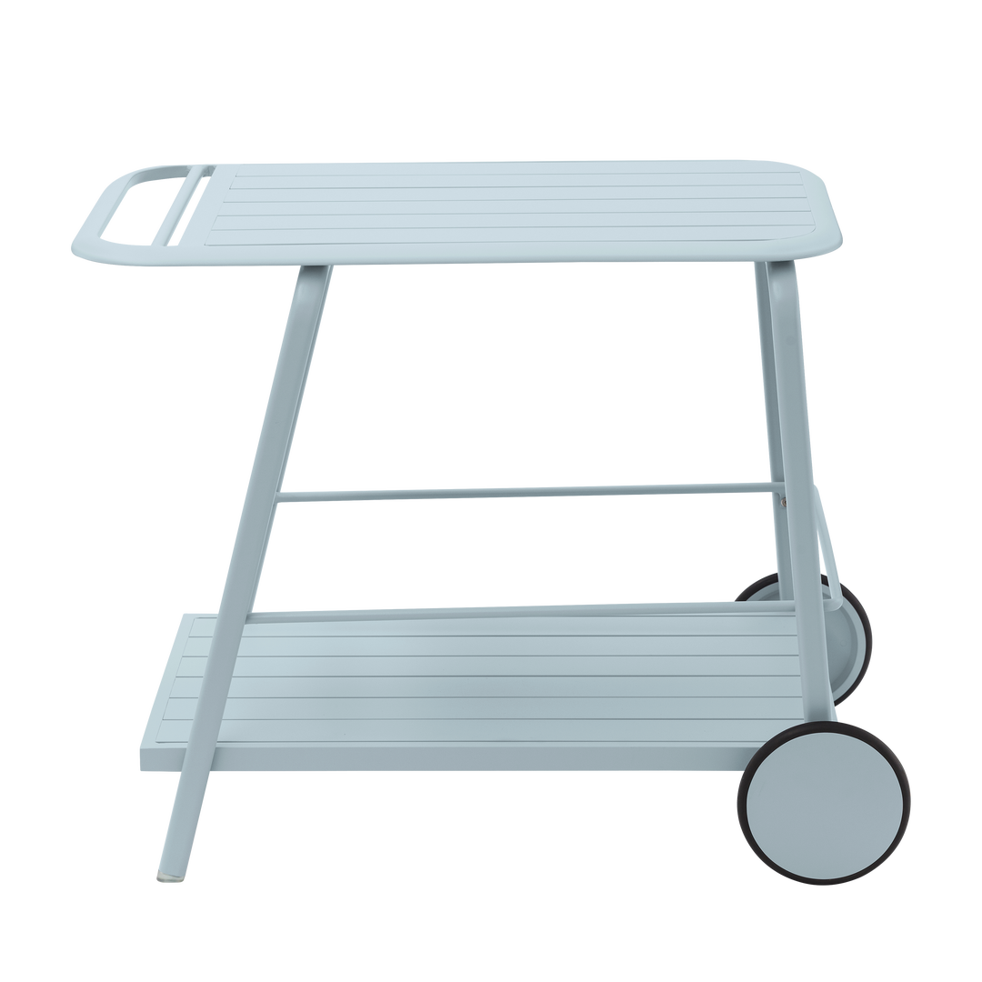Αποτελούμενο από δύο μεγάλους δίσκους, το τρόλεϊ Naterial Idaho είναι ιδανικό για να συνοδεύσει τα γεύματά σας στη βεράντα ή τον κήπο. Εξοπλισμένο με λαβή και δύο τροχούς μετακινείται εύκολα για να σας επιτρέψει να ετοιμάσετε και να καθαρίσετε το τραπέζι του κήπου σας χωρίς κόπο. Το κάτω ράφι του είναι εξοπλισμένο με προστατευτική μπάρα για να αποτρέπει την πτώση των μπουκαλιών κατά τη μετακίνηση. Κατασκευασμένο από αλουμίνιο είναι ανθεκτικό στη βροχή, στην αλμύρα από την παραλία και την καταπόνηση/χρήση της καθημερινότητας. Οι ευθείες γραμμές και οι γωνίες αναδεικνύουν το design στυλ που ενισχύεται από την επιλογή του αλουμινίου ως κύριου υλικού. Αυτό το τρόλεϊ είναι ιδανικό ως συμπλήρωμα της σειράς Idaho. Τα προϊόντα της σειράς Idaho είναι διαθέσιμα σε 8 χρώματα που συνδυάζονται για να σας επιτρέπουν να προσαρμόσετε το εξωτερικό σας όπως επιθυμείτε.Το ματ φινίρισμα τοποθετεί αυτή τη σειρά στις τελευταίες τάσεις διακόσμησης. Διαστάσεις: Μ88,5xΠ57xY69,5cm