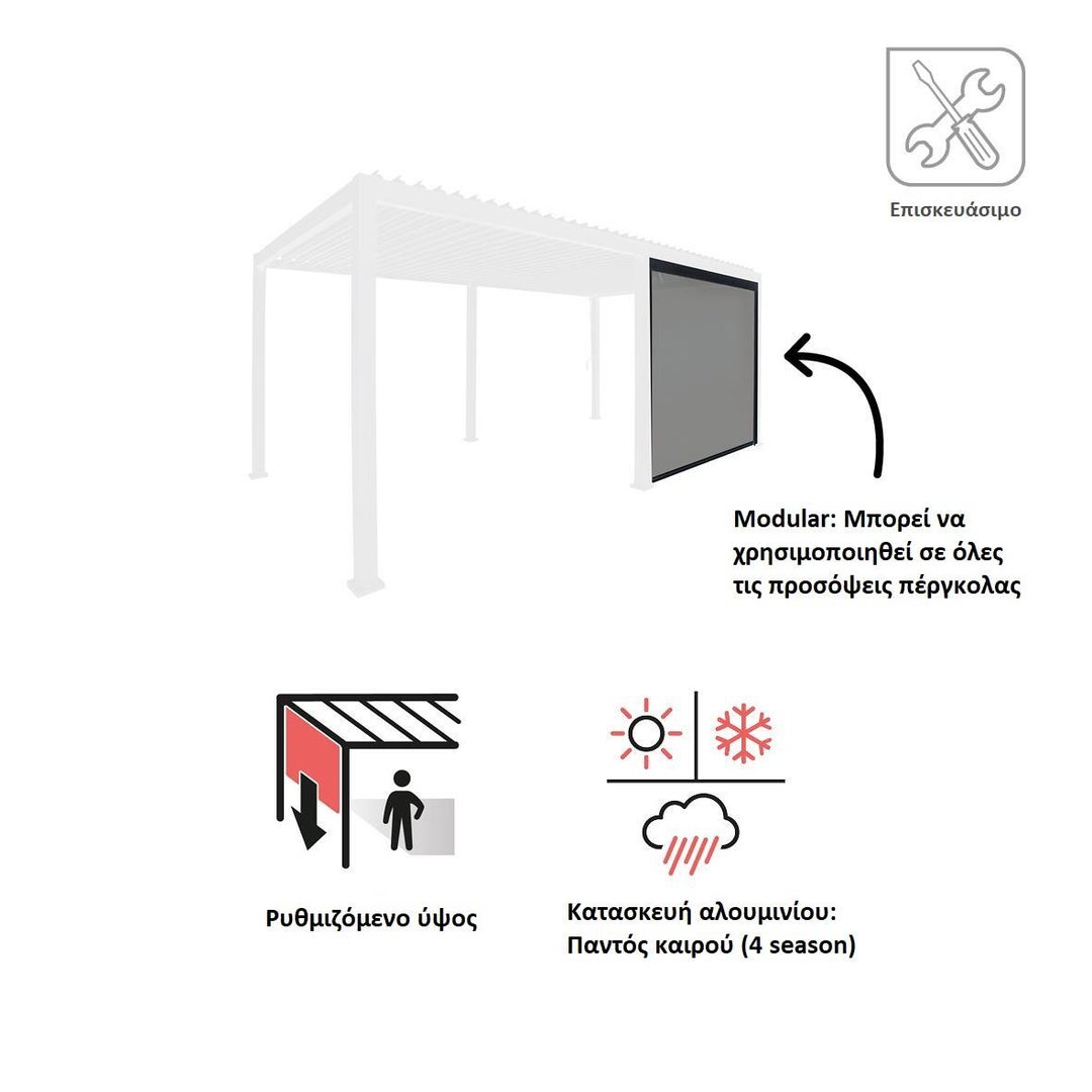Σε ήλιο ή βροχή, απολαύστε την ύπαιθρο σας σε κάθε περίσταση. Προστατέψτε τον εαυτό σας από τον ήλιο και τα αδιάκριτα βλέμματα με την κουρτίνα Modus. Σχεδιασμένη για να στερεώνεται στη βιοκλιματική πέργκολα Modus, η τέντα Modus 3,6 μέτρων θα σας επιτρέψει να απολαύσετε οικογενειακά γεύματα σε κάθε καιρό, εμποδίζοντας τη βροχή ή τον καυτό ήλιο. Αδιαφανές, θα σας επιτρέψει επίσης να δημιουργήσετε μια οικεία και φιλική τραπεζαρία προστατευμένη από τα μάτια των γειτόνων σας. Μπορεί να ρυθμιστεί σε οποιοδήποτε ύψος για να προσαρμόζεται στις ανάγκες και τις δραστηριότητές σας. Modular μπορεί να στερεωθεί σε όλες τις πλευρές της πέργκολας. Πρακτικό και εύκολο στο συνδυασμό. Το χρώμα της κουρτίνας και ο σχεδιασμός της από αλουμίνιο και ύφασμα της επιτρέπουν να διατηρήσει το ντιζάιν στυλ της πέργκολας σας Modus, φέρνοντας στυλ στο εξωτερικό σας, ενώ σας επιτρέπει να το συνδυάσετε με τα περισσότερα έπιπλα κήπου. Συνδυάστε το με την πέργκολα Modus ή τις επεκτάσεις της για ιδανική εγκατάσταση. Εύκολη συντήρηση. Κατασκευασμένη από ύφασμα textilene, η κουρτίνα συντηρείται εύκολα. Διατίθενται επισκευάσιμα ανταλλα