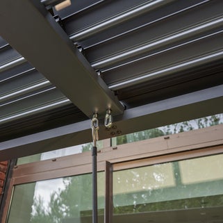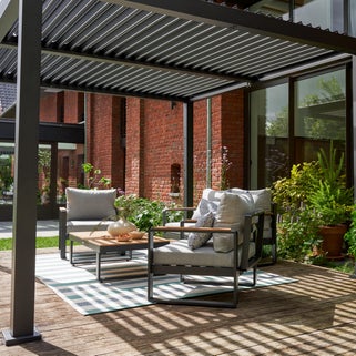 Κιόσκι πέργκολα Naterial Clima Bio με σκελετό και κάλυμμα αλουμινίου, που προστατεύει από τη βροχή και τις ακτίνες του ήλιου επιτρέποντας τη μέγιστη χρήση του φυσικού φωτός. Σε άμεσο ηλιακό φως ή στη βροχή, απολαύστε τους εξωτερικούς σας χώρους και ζήστε σε απόλυτη αρμονία με το περιβάλλον με το βιοκλιματικό κιόσκι Clima. Προσανατολίστε τα δύο μπλοκ λεπίδων για να σκιάσετε τη βεράντα και το εσωτερικό σας, ενώ μειώνετε τη θερμότητα κατά τη διάρκεια του γεύματoς σε εξωτερικούς χώρους. Οι αλουμινένιες λεπίδες του, όταν είναι υπό γωνία δημιουργούν ένα ήπιο ρεύμα αέρα δροσιάς κάτω από το κιόσκι αφήνοντας τον ζεστό αέρα να διαφεύγει. Σε περίπτωση βροχής, κλείστε τελείως την οροφή. Το κιόσκι είναι εξοπλισμένο με σύστημα αποστράγγισης με ροή νερού στους πρόποδες της κατασκευής. Γείρετε τις λεπίδες κάθετα όταν θέλετε λίγο φως και ζεστασιά στο αίθριο και στο σπίτι σας. Καλύπτει έκταση 9,69 m². Το αντιανεμικό του σύστημα παρέχει μεγαλύτερη σταθερότητα στην κατασκευή. Ο σύγχρονος σχεδιασμός του bio Clima δίνει στυλ στους εξωτερικούς σας χώρους και συνδυάζεται με τα περισσότερα σαλόνια κήπου