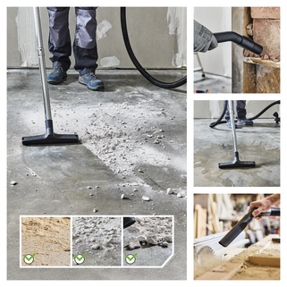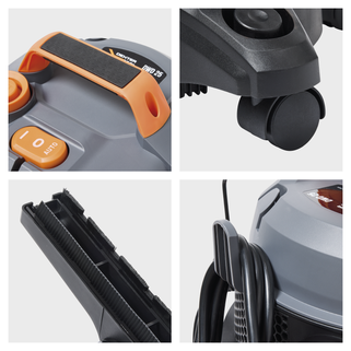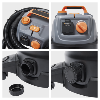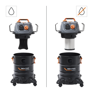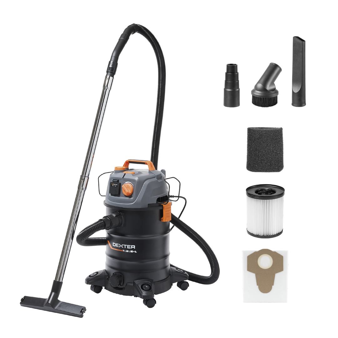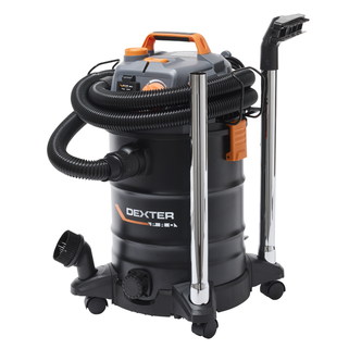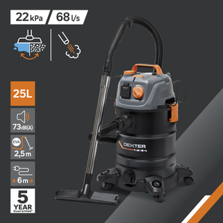Η επαγγελματική σκούπα DEXTER Pro DWD25 με ισχύ 1400W προσφέρει κορυφαία αναρρόφηση για νερό, λεπτόκοκκη σκόνη, ροκανίδια και μεγάλα υπολείμματα. Είναι εξοπλισμένη με πρίζα σύνδεσης ηλεκτρικών εργαλείων (έως 2280W) που διαθέτει λειτουργία αυτόματου συγχρονισμού, επιτρέποντας στη σκούπα να ξεκινά και να σταματά ταυτόχρονα με το εργαλείο σας. Διαθέτει μεταλλικό κάδο 25 λίτρων με τάπα αποστράγγισης για εύκολο άδειασμα υγρών, μεταβλητό έλεγχο ταχύτητας για προσαρμογή της ισχύος και ειδική λειτουργία καθαρισμού φίλτρου για σταθερή απόδοση. Ο σχεδιασμός της περιλαμβάνει λειτουργία φυσήματος, καλώδιο 6 μέτρων για μέγιστη ευελιξία και φίλτρο HEPA για ανώτερο φιλτράρισμα. Η κεφαλή είναι κατασκευασμένη από 100% ανακυκλωμένο πλαστικό, ενώ η συσκευασία περιλαμβάνει πλήρη γκάμα εξαρτημάτων, όπως μεταλλικούς σωλήνες και πέλμα με ρόδες, που αποθηκεύονται πρακτικά πάνω στη σκούπα.