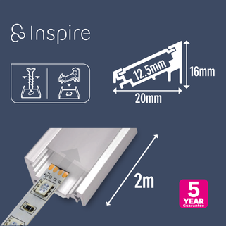 Συμβατό με τις ταινίες LED Inspire "Cutflexi", αυτό το γωνιακό προφίλ αλουμινίου ασημί χρώματος μήκους 2 μέτρων θα παρέχει ομοιόμορφο φωτισμό χωρίς αντανακλάσεις σε όλο το σπίτι σας, είτε σε τοίχους είτε σε έπιπλα. Προστατεύει επίσης την ταινία LED σας και σας επιτρέπει να ολοκληρώσετε κομψά το έργο φωτισμού σας. Διατίθεται επίσης σε λευκό και μαύρο χρώμα για να ταιριάζει απόλυτα με τη διακόσμησή σας, καθώς και σε εκδόσεις με εσοχή ή τοποθέτηση σε επιφάνεια (επίπεδο προφίλ).