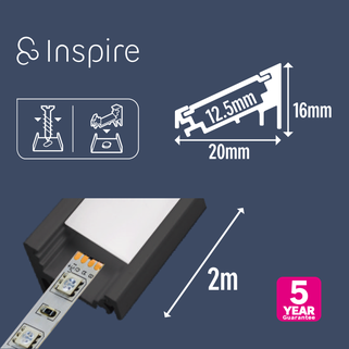 Συμβατό με τις ταινίες LED Inspire "Cutflexi", αυτό το γωνιακό προφίλ αλουμινίου μαύρου χρώματος μήκους 2 μέτρων θα παρέχει ομοιόμορφο φωτισμό χωρίς αντανακλάσεις σε όλο το σπίτι σας, είτε σε τοίχους είτε σε έπιπλα. Προστατεύει επίσης την ταινία LED σας και σας επιτρέπει να ολοκληρώσετε κομψά το έργο φωτισμού σας. Διατίθεται επίσης σε λευκό και μαύρο χρώμα για να ταιριάζει απόλυτα με τη διακόσμησή σας, καθώς και σε εκδόσεις με εσοχή ή τοποθέτηση σε επιφάνεια (επίπεδο προφίλ).
