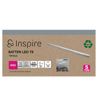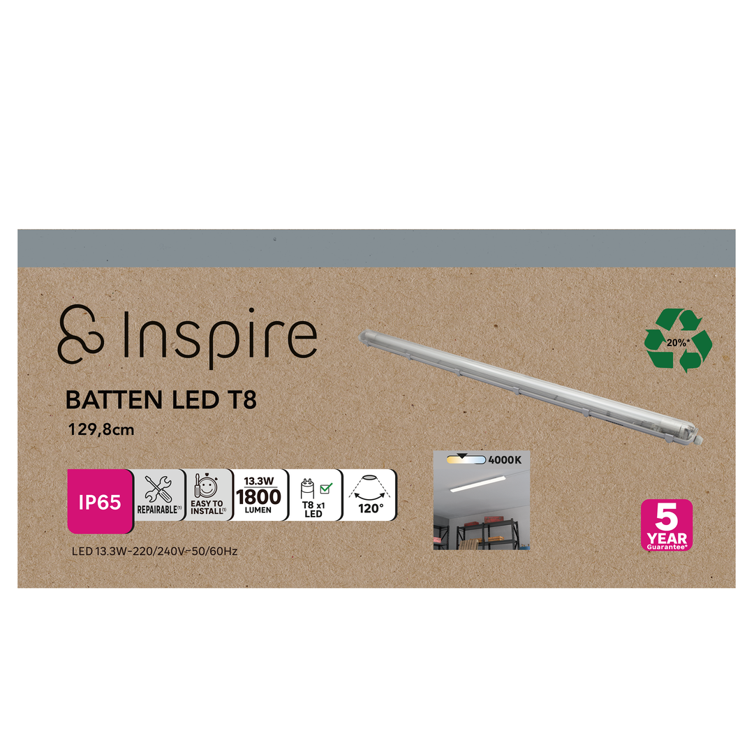 Το φωτιστικό ράγα Batten LED T8 (128 cm) με τον λαμπτήρα LEXMAN T8 (περιλαμβάνεται) θα φωτίσει τέλεια τα γκαράζ και τα εργαστήριά σας με τη γωνία δέσμης 120°. Το ουδέτερο λευκό (4000 K) και η φωτεινότητα 1800 lumen θα αποτελέσουν τον ιδανικό φωτισμό για όλα τα DIY έργα σας. Αυτό το προϊόν INSPIRE είναι εύκολο στην εγκατάσταση, επισκευάσιμο και διαθέτει 5ετή εγγύηση.