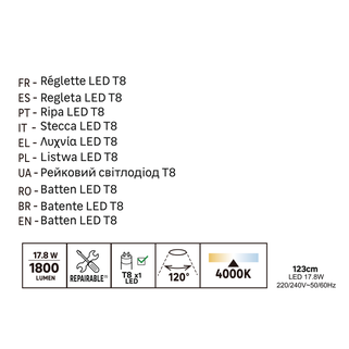 Αυτή η ράγα φωτισμού 124,7 cm με βαθμολογία IP20 είναι ιδανική για τον φωτισμό του γκαράζ, του εργαστηρίου, της κουζίνας ή του βοηθητικού χώρου σας χωρίς υγρασία, χάρη στο ουδέτερο λευκό φως των 4000 Kelvin. Διαθέτει αντικαταστάσιμο σωλήνα LED T8 και είναι επισκευάσιμος. Διατίθεται επίσης σε μήκος 62 cm.