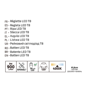 Αυτή η ράγα φωτισμού 62 cm με βαθμολογία IP20 είναι ιδανική για τον φωτισμό του γκαράζ, του εργαστηρίου, της κουζίνας ή του βοηθητικού χώρου σας χωρίς υγρασία, χάρη στο ουδέτερο λευκό φως των 4000 Kelvin. Διαθέτει αντικαταστάσιμο σωλήνα LED T8 και είναι επισκευάσιμος. Διατίθεται επίσης σε μήκος 125 cm.