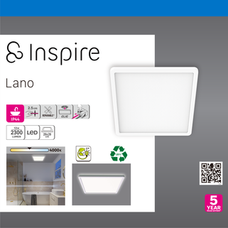 Το φωτιστικό μπάνιου LED "Lano" 29cm από την INSPIRE είναι ιδανικό για τον φωτισμό του μπάνιου σας (εκτός από τις περιοχές ντους και μπανιέρας) χάρη στο βαθμό προστασίας IP44 που διαθέτει. Προσφέρει φωτεινότητα 2300 lumen και ουδέτερο λευκό φως 4000 Kelvin. Ο εξαιρετικά λεπτός σχεδιασμός του δημιουργεί ένα διακριτικό φωτοστέφανο στην κορυφή της οροφής, με αποτέλεσμα μια διακριτική και κομψή ατμόσφαιρα. Το σύστημα εύκολης σύνδεσης απλοποιεί την εγκατάσταση. Η δυνατότητα επισκευής, η ενεργειακή απόδοση και η περιεκτικότητα σε ανακυκλωμένο πλαστικό κατά 25% το καθιστούν ένα φιλικό προς το περιβάλλον προϊόν. Αυτό το φωτιστικό οροφής διατίθεται σε διάφορα χρώματα και σχήματα (τετράγωνο ή ορθογώνιο).