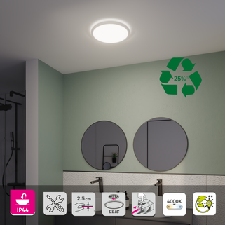 Το φωτιστικό μπάνιου LED "Lano" διαμέτρου 29 cm από την INSPIRE είναι ιδανικό για τον φωτισμό του μπάνιου σας (εκτός από τις περιοχές ντους και μπανιέρας) χάρη στο βαθμό προστασίας IP44 που διαθέτει. Προσφέρει φωτεινότητα 2300 lumen και ουδέτερο λευκό φως 4000 Kelvin. Ο εξαιρετικά λεπτός σχεδιασμός του δημιουργεί ένα διακριτικό φωτοστέφανο στην κορυφή της οροφής, με αποτέλεσμα μια διακριτική και κομψή ατμόσφαιρα. Το σύστημα εύκολης σύνδεσης απλοποιεί την εγκατάσταση. Η δυνατότητα επισκευής, η ενεργειακή απόδοση και η περιεκτικότητα σε ανακυκλωμένο πλαστικό κατά 25% το καθιστούν ένα φιλικό προς το περιβάλλον προϊόν. Αυτό το φωτιστικό οροφής διατίθεται σε διάφορα χρώματα και σχήματα (τετράγωνο ή ορθογώνιο).