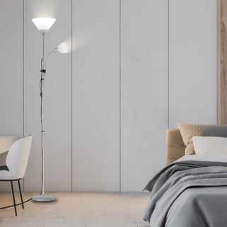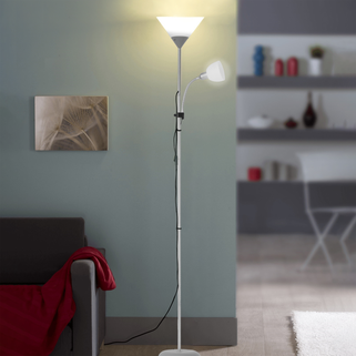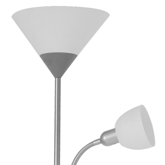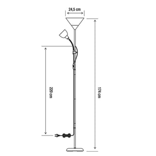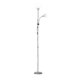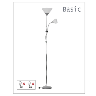 Φωτίστε το σπίτι σας με το επιδαπέδιο φωτιστικό Basic με ενσωματωμένο φως ανάγνωσης. Με ύψος 177 cm, αυτό το κομψό επιδαπέδιο φωτιστικό, με το ασημί μεταλλικό σκελετό και το καπέλο PVC, διαθέτει δύο πηγές φωτός: μία 60W και μία 40W. Ιδανικό τόσο για γενικό όσο και για επαγγελματικό φωτισμό χάρη στο φως ανάγνωσης, η στιβαρή βάση διαμέτρου 24,5 cm εξασφαλίζει εξαιρετική σταθερότητα και ο απλός σχεδιασμός του ενσωματώνεται άψογα σε κάθε χώρο.