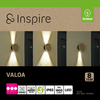 Προσθέστε μια πινελιά μοντέρνου στυλ στον εξωτερικό σας χώρο με το εξωτερικό φωτιστικό τοίχου LED "Valoa" από την INSPIRE. Σχεδιασμένο με προστασία IP65, είναι ιδανικό για τον φωτισμό των εξωτερικών σας χώρων, παρέχοντας ουδέτερο λευκό φως (4000 Kelvin), φωτεινή ροή 1600 lumen και δημιουργώντας ενδιαφέροντα φωτεινά μοτίβα στην πρόσοψή σας. Αυτό το φωτιστικό τοίχου προσφέρει διάφορες επιλογές φωτισμού: φωτισμό προς τα κάτω, προς τα πάνω ή προς τα κάτω με διαφορετικά φάσματα φωτός. Αυτό το προϊόν είναι επισκευάσιμο και περιέχει μια ενεργειακά αποδοτική πηγή φωτός κατηγορίας C. Συνοδεύεται από 8ετή εγγύηση.