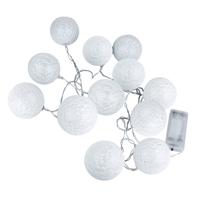 Η γιρλάντα LED με μπάλες από βαμβάκι αποτελεί μια εξαιρετική προσθήκη στον εσωτερικό σας χώρο. Διακοσμεί απαλά και αποτελεσματικά το χώρο και σας επιτρέπει να εξοικονομείτε ηλεκτρική ενέργεια. Η γιρλάντα αποτελείται από 12 λαμπερές μπάλες σε λευκό χρώμα. Η διάμετρος της μπάλας είναι 6 cm. Η γιρλάντα LED αποτελείται από 12 μπάλες που συνδέονται με ένα διαφανές σύρμα. Μπορείτε να τυλίξετε τη γιρλάντα γύρω από το κιγκλίδωμα της σκάλας για να φωτίσετε την είσοδο του σπιτιού σας. Η αλυσίδα μπορεί επίσης να κρεμαστεί σε γάντζους στερεωμένους στον τοίχο, σε ένα ράφι ή σε ένα παράθυρο. Η απόσταση μεταξύ των μπαλών είναι 15 cm. Οι γιρλάντες κάνουν εξαιρετική δουλειά στη διακόσμηση χριστουγεννιάτικων δέντρων, κατασκηνώσεων και βεραντών. Οι αλυσίδες LED τροφοδοτούνται με μπαταρίες. Χρειάζεστε μόνο δύο μπαταρίες AA. Μπορείτε να τις κρεμάσετε οπουδήποτε χωρίς να χρειάζεστε πρίζα. Η γιρλάντα εκπέμπει ζεστό φως (3000 K) που δίνει στο εσωτερικό έναν ζεστό και φιλόξενο χαρακτήρα.