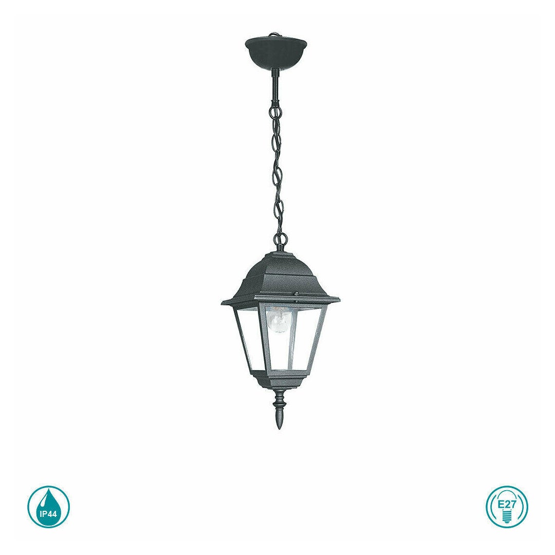 Κρεμαστό Roma από αλουμίνιο και γυαλί διάφανο. Με δείκτη στεγανότητας IP43 και σπείρωμα λαμπτήρα E27. Δεν περιλαμβάνεται ο λαμπτήρας
