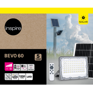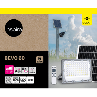 Αυτός ο ηλιακός προβολέας Bevo από την INSPIRE, IP65 και 4000K, είναι ιδανικός για τον φωτισμό του εξωτερικού σας χώρου με ενέργεια. Πρόκειται για ένα υψηλής ποιότητας ηλιακό σύστημα φωτισμού LED, που αποτελείται από ένα μονοκρυσταλλικό φωτοβολταϊκό πάνελ με επιτοίχια βάση, ένα μοντέρνο, λεπτό εξωτερικό σποτ με ενσωματωμένη επαναφορτιζόμενη μπαταρία υψηλής απόδοσης και ένα τηλεχειριστήριο για τη διαχείριση χειροκίνητων και προγραμματισμένων λειτουργιών. Μπορείτε να επιλέξετε ανάμεσα σε 5 επίπεδα φωτεινότητας, που κυμαίνονται από χαμηλό έως υψηλό. Η φωτεινή ισχύς αυξάνεται καθώς φορτίζεται η μπαταρία: με πλήρη φόρτιση, το φωτιστικό θα φωτίζει με τη μέγιστη φωτεινότητα των 1200 lumens. Το προϊόν είναι εξοπλισμένο με χρονοδιακόπτη που σας επιτρέπει να φωτίζετε για 3 ώρες, 5 ώρες ή 8 ώρες. Αυτό το ενσωματωμένο προϊόν LED έχει 5ετή εγγύηση και είναι επισκευάσιμο.