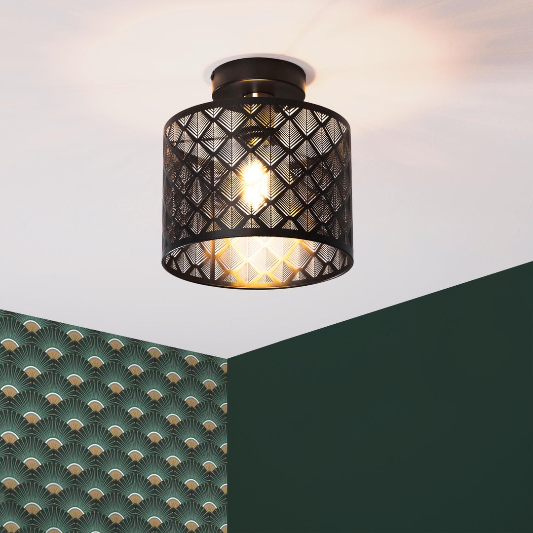 Πλαφονιέρα φωτιστικό τοίχου INSPIRE Galati κατασκευασμένο από μέταλλο με μαύρο φινίρισμα. Εντυπωσιάζει με την κομψή και διάτρητη επιφάνειά του για ένα ημιδιαφανές αποτέλεσμα που εξασφαλίζει μια όμορφη διακριτική ατμόσφαιρα. Απολαύστε την κομψότητα του μαύρου αμπαζουρ με ορειχάλκινη λεπτομέρεια για κομψή και ντελικάτη εμφάνιση. Μπορείτε να επιλέξετε έναν διαφανή ή πορτοκαλί λαμπτήρα πυρακτώσεως LED για να βελτιώσετε τα εφέ φωτός και να φωτίσετε το σπίτι σας εξοικονομώντας ενέργεια. Διατίθεται σε κρεμαστό, τοίχου και επιτραπέζιο φωτιστικο. Με 5 χρόνια εγγύηση.