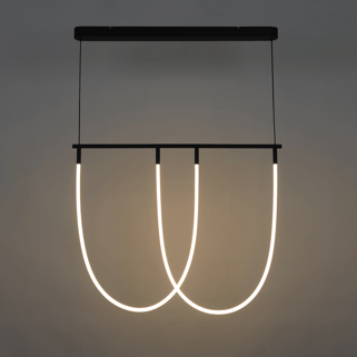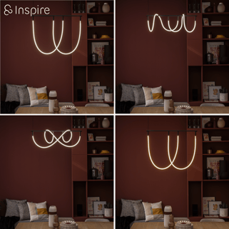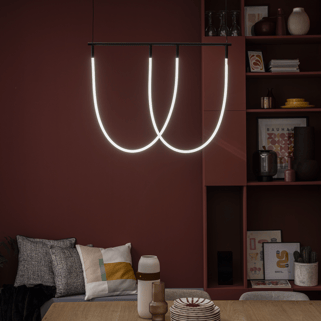 Το κρεμαστό φωτιστικό led neon Anelo από την INSPIRE είναι ένα κομψό και μοντέρνο φωτιστικό σχεδιασμένο να συνδυάζει στυλ και λειτουργικότητα. Οι ρευστές γραμμές και η γεωμετρική του μορφή προσδίδουν μια εκλεπτυσμένη και δυναμική παρουσία σε κάθε εσωτερικό χώρο. Αυτό το αρθρωτό κρεμαστό φωτιστικό, με ρυθμιζόμενο καλώδιο και μέγιστο μήκος 120 cm, προσαρμόζεται τέλεια σε διάφορους χώρους. Με φωτεινότητα 4500 lumen, εγγυάται φωτεινό και αποτελεσματικό φωτισμό. Το συμπεριλαμβανόμενο τηλεχειριστήριο (2 μπαταρίες AAA πωλούνται ξεχωριστά) σας επιτρέπει να ρυθμίσετε τη θερμοκρασία χρώματος του λευκού φωτός, από θερμό λευκό (3000 K) για μια ζεστή ατμόσφαιρα έως ψυχρό λευκό (6000 K) για πιο δυναμικό και λειτουργικό φωτισμό. Επιπλέον, η λειτουργία ρύθμισης φωτεινότητας σας επιτρέπει να εξατομικεύσετε τη φωτεινότητα. Η μαύρη μεταλλική δομή, σε συνδυασμό με λευκούς διαχύτες σιλικόνης, δημιουργεί μια εκλεπτυσμένη και σύγχρονη αισθητική. Αυτό το φωτιστικό είναι ιδανικό για σαλόνια, τραπεζαρίες, κουζίνες ή γραφεία, όπου ο ρυθμιζόμενος φωτισμός και ο μοντέρνος σχεδιασμός του ενισχύουν την άνεση και τη λειτουργικό