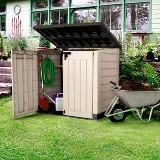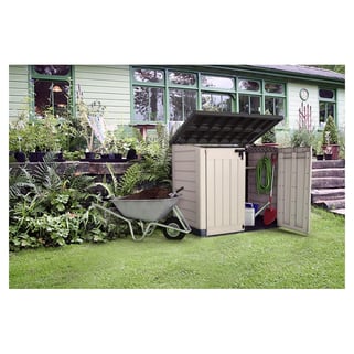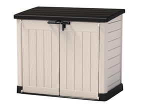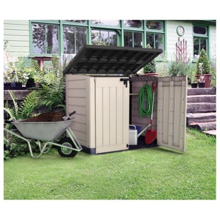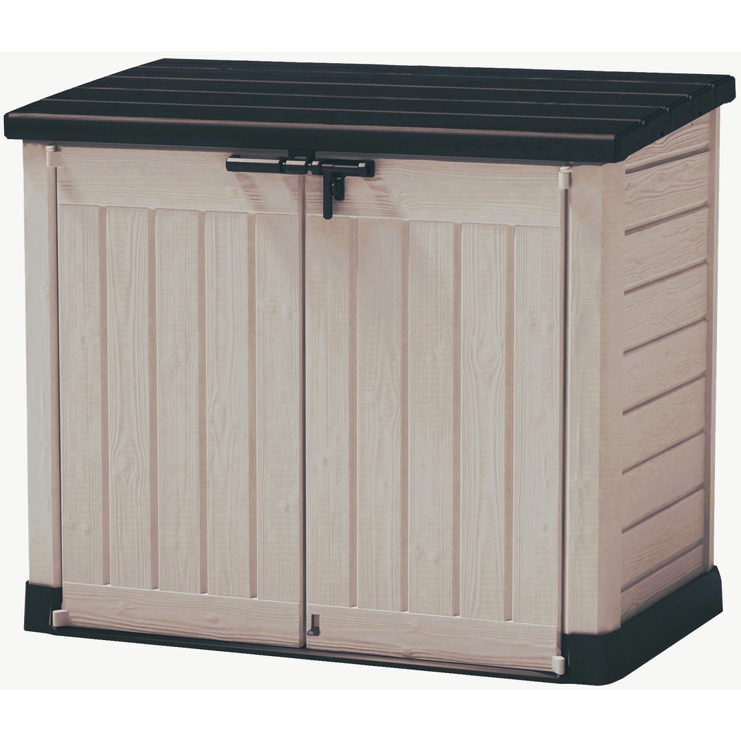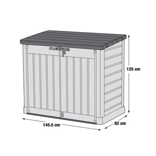 Μπαούλο αποθήκευσης κήπου από ρητίνη με μπεζ και καφέ φινίρισμα απομίμησης ξύλου. Έχει χωρητικότητα 1200 λίτρων, ιδανικό για κάθε είδους προϊόντα ή σκεύη κήπου, όπως εργαλεία και δομικά υλικά. Το εσωτερικό είναι εύκολα προσβάσιμο χάρη στο επάνω καπάκι και τις δύο μπροστινές πόρτες που μπορούν να κλείσουν με λουκέτο. Η ανθεκτική στην υπεριώδη ακτινοβολία επεξεργασία του είναι ιδανική για να αντέχει για μεγάλο χρονικό διάστημα σε εξωτερικούς χώρους και να αποτρέπει τον αποχρωματισμό. Εύκολη συναρμολόγηση. Διαστάσεις: 146 x 125 x 82 cm (πλάτος x ύψος x βάθος).