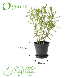Η πλαστική γλάστρα Taïga Geolia κατασκευάζεται από 65% ανακυκλωμένο πλαστικό και διατίθεται σε διάφορα χρώματα και μεγέθη. Διαθέτει οπές αποστράγγισης και ένα αντίστοιχο πιατάκι διατίθεται ξεχωριστά.