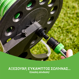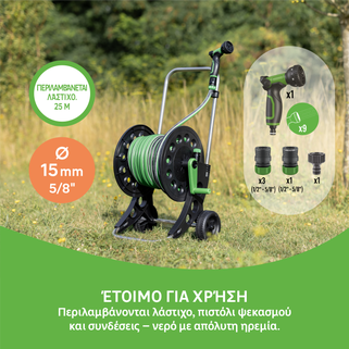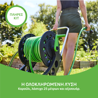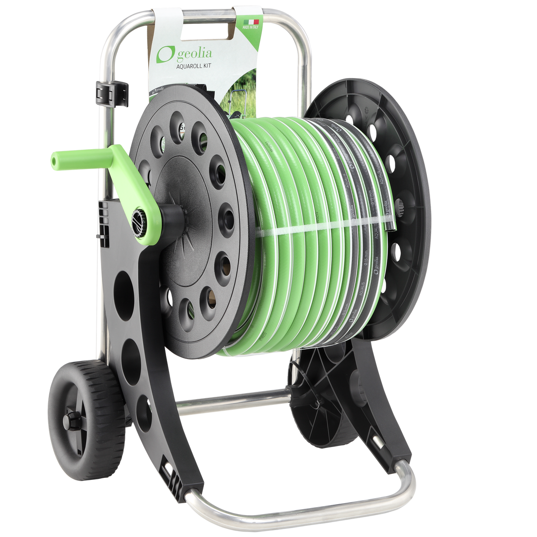 Αυτό το καρούλι ποτίσματος Geolia AQUAROLL με ρόδες είναι η ιδανική λύση για την οργάνωση του κήπου σας και την παροχή ιδανικού αποθηκευτικού χώρου. Παρέχεται με 25 μέτρα λάστιχου AQUALIS (50% ανακυκλωμένο) και ένα πλήρες σετ συνδέσμων, έτοιμο για τακτική χρήση. Το λάστιχο είναι ανθεκτικό στην πίεση έως και 21 bar και συνοδεύεται από 25ετή εγγύηση. Το κιτ περιλαμβάνει πιστόλι ψεκασμού, προσαρμογέα βρύσης και συνδέσμους Aquastop για να εξασφαλίζεται ένα περιβάλλον χωρίς διαρροές. Το καρούλι καλύπτεται από 5ετή εγγύηση.