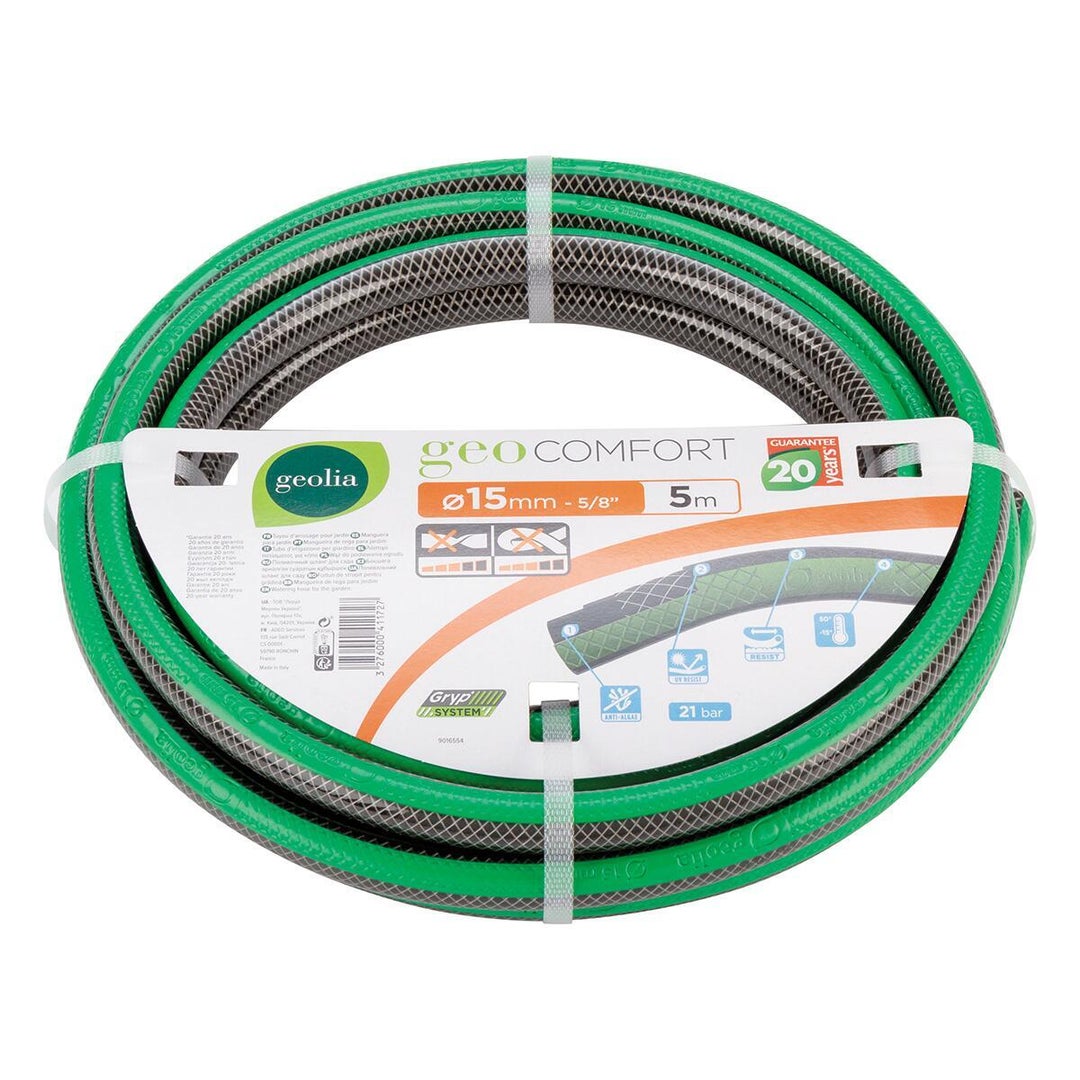 Λάστιχo Comfort GEOLIA με μήκος σωλήνα 5 m και διάμετρο λάστιχου Ø 15 mm. Είναι φτιαγμένο από ανθεκτικό υλικό ώστε να αντέχει σε πίεση έως 21bar Πλεονεκτήματα ανθεκτικό στην πίεση και τις μεταβολές της θερμοκρασίας, ανθεκτικό στην ακτινοβολία UV
