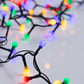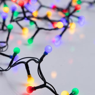 Χριστουγεννιάτικα φωτάκια για εσωτερική και εξωτερική χρήση, εξοπλισμένα με 300 LED, με 8 προγράμματα με μνήμη, μετασχηματιστή και πολύχρωμο φωτισμό (εναλλαγή ανα 5cm). Επέκταση έως 3m και πράσινο καλώδιο, σχεδόν αόρατο στο φόντο των πράσινων κλαδιών.