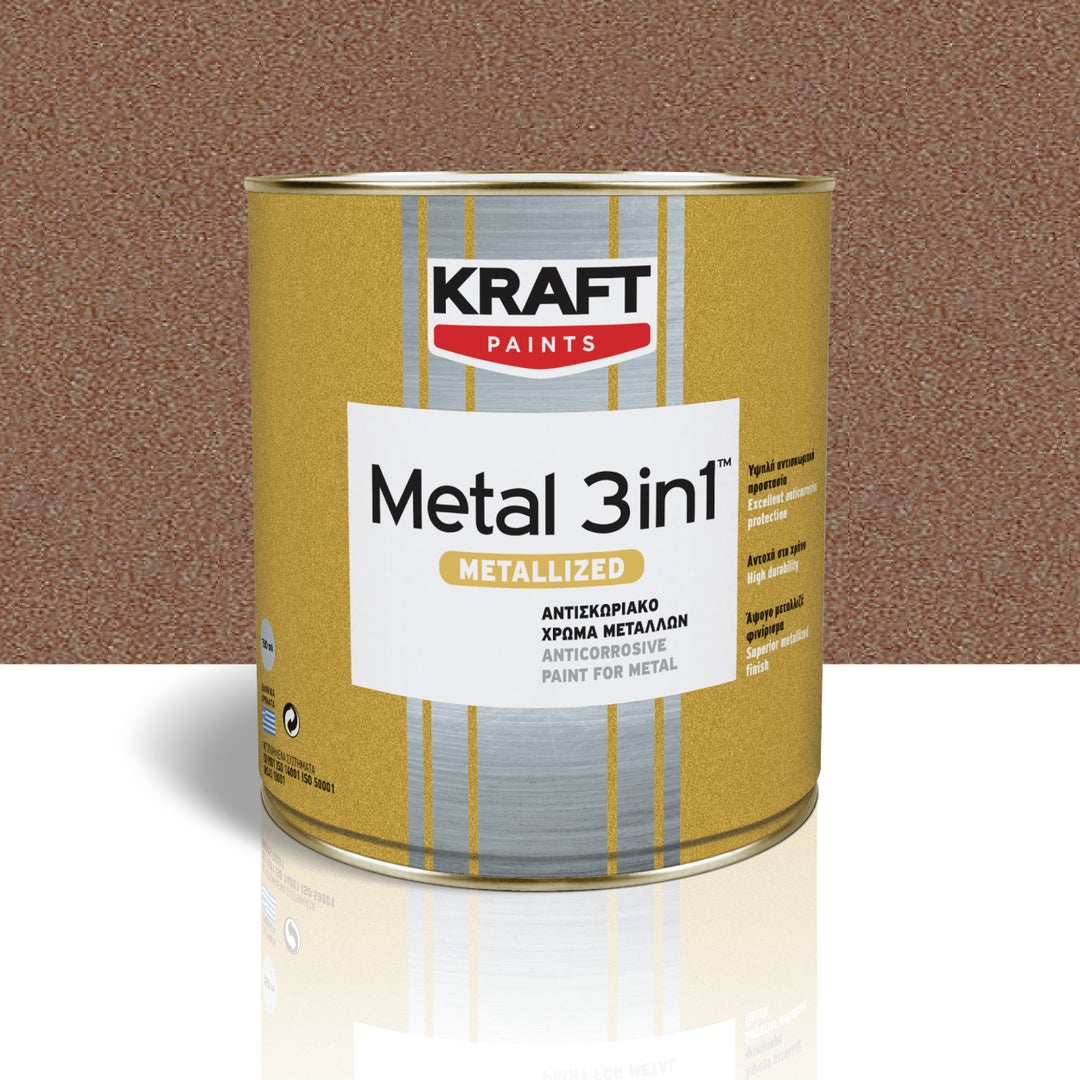 Αντισκωριακό KRAFT METAL 3 IN 1 για εσωτερική και εξωτερική χρήση, υψηλής ποιότητας και αντοχής κατάλληλο για μεταλλικές επιφάνειες. Είναι ανθεκτικό, ταχυστέγνωτο, με εξαιρετική αντοχή στα χτυπήματα, στο πλύσιμο και στις δύσκολες καιρικές συνθήκες. Εφαρμόζεται απευθείας σε νέες ή παλιές σκουριασμένες μεταλλικές επιφάνειες και εξασφαλίζει προστασία από την σκουριά εμποδίζοντας την εεπανεμφάνισητης.