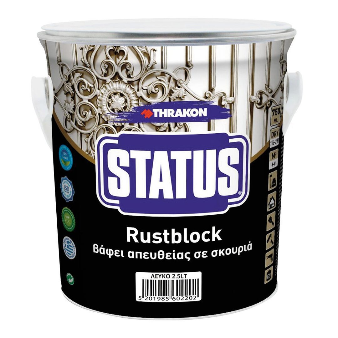 Αντισκωριακό THRAKON Status Rustblock για εσωτερική και εξωτερική χρήση, υψηλής ποιότητας και αντοχής κατάλληλο για μεταλλικές επιφάνειες. Είναι ανθεκτικό, ταχυστέγνωτο, με εξαιρετική αντοχή στα χτυπήματα, στο πλύσιμο και στις δύσκολες καιρικές συνθήκες. Εφαρμόζεται απευθείας σε νέες ή παλιές σκουριασμένες μεταλλικές επιφάνειες και εξασφαλίζει προστασία από την σκουριά εμποδίζοντας την επανεμφάνισή της.