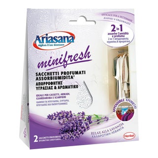 Ο συλλέκτης υγρασίας ARIASANA Minifresh είναι κατάλληλος για την απομάκρυνση της υγρασίας από τον αέρα στο χώρο. Λειτουργεί για σχεδόν 2 μήνες σε δωμάτια έως 1 m³ περίπου, ανάλογα με την θερμοκρασία και την υγρασία του αέρα. Είναι αποτελεσματικός για υδρατμούς, δυσάρεστη οσμή, υγρασία. Ιδανικός για χώρους όπως ντουλάπια κουζίνας, ντουλάπια, γκαρνταρόμπα κ.α.