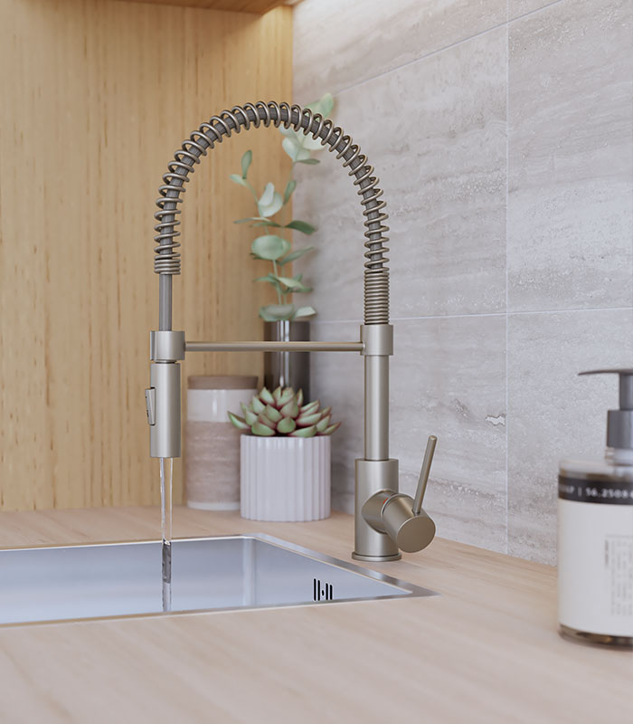 - Η pull-out μπαταρία διαθέτει στόμιο που τραβιέται οριζόντια προς τα έξω, σαν χειροκίνητο ντους. Είναι ιδανική για μικρούς πάγκους ή μονές γούρνες, αφού σου επιτρέπει να πλένεις σκεύη, να γεμίζεις δοχεία ή να καθαρίζεις τις άκρες του νεροχύτη με ευκολία και ακρίβεια.