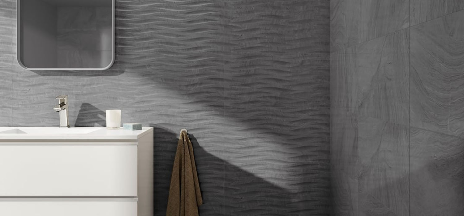 Τα XL πλακάκια κυριαρχούν. Επιφάνειες 60x120 ή 120x120 cm δημιουργούν μια καθαρή, μονοκόμματη αισθητική που κάνει ακόμα και το μικρότερο μπάνιο να δείχνει μεγαλύτερο. Εκτός από την αισθητική, προσφέρουν και πρακτικά οφέλη: λιγότεροι αρμοί σημαίνουν λιγότερη συντήρηση και καθάρισμα. 3. Μοτίβα με έντονη γεωμετρία ή 3D εφέ