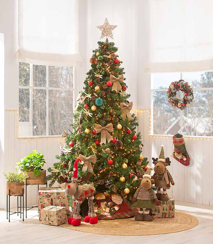 1. Πράσινο δέντρο: Το πιο κλασικό και ευέλικτο· ταιριάζει σχεδόν με κάθε παλέτα. Δείχνει λαμπερό με κόκκινο–χρυσό για το παραδοσιακό look, δένει με φυσικές αποχρώσεις (κανέλα, ξύλο, μπεζ) για πιο cosy στυλ και υποστηρίζει τέλεια το country με καρό ή ξύλινα στολίδια.