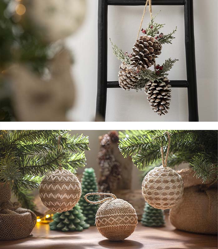 4. Country/Cosy (κανέλα, ξύλο, μπεζ): Η φυσικότητα είναι το παν. Ένα μικρό στεφανάκι από κλαδιά, ένα ξύλινο αστέρι ή ένας φιόγκος από λινάτσα είναι οι πιο ταιριαστές επιλογές για ρουστίκ και ζεστή αίσθηση.