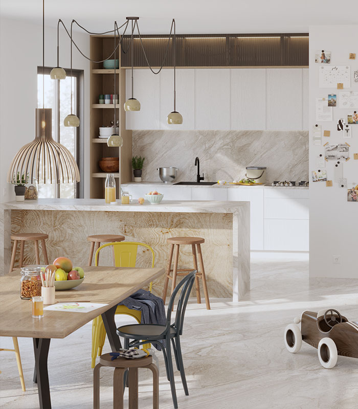 Με τον σωστό φωτισμό, η κουζίνα γίνεται φυσική συνέχεια του σαλονιού και ο χώρος αποκτά συνοχή.