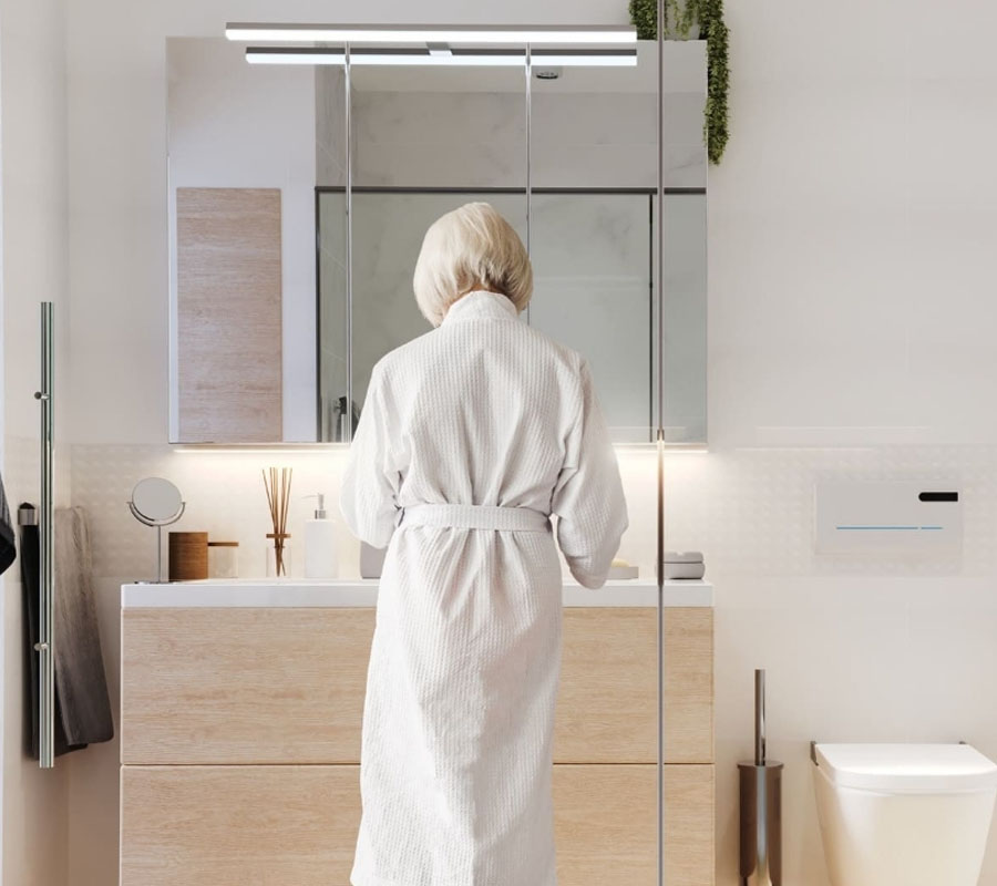 4. Καθρέπτες με LED φωτισμό: Ένας καθρέφτης μπάνιου με ενσωματωμένο LED προσφέρει ομοιόμορφο φωτισμό στο πρόσωπο (ιδανικό για καθημερινή περιποίηση) και ταυτόχρονα αναβαθμίζει αισθητικά το μπάνιο με μοντέρνα αίσθηση.