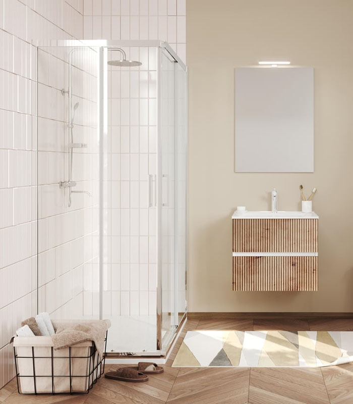 - Φωτισμό: Για το φωτισμό προτίμησε φωτιστικά μπάνιου με πιστοποίηση IP44, που αντέχουν την υγρασία. Επένδυσε σε καθρέπτη με ενσωματωμένο LED φως για πιο καθαρό φως.