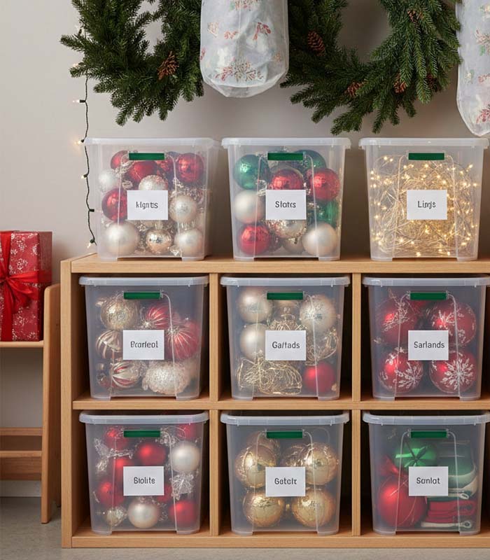 Τα διαφανή κουτιά σου επιτρέπουν να δεις τι περιέχει το καθένα χωρίς να τα ανοίγεις. Αν προσθέσεις και χάρτινα ή υφασμάτινα διαχωριστικά, έχεις έξτρα προστασία και οργάνωση, ειδικά για μπάλες ή μικρά στολίδια.