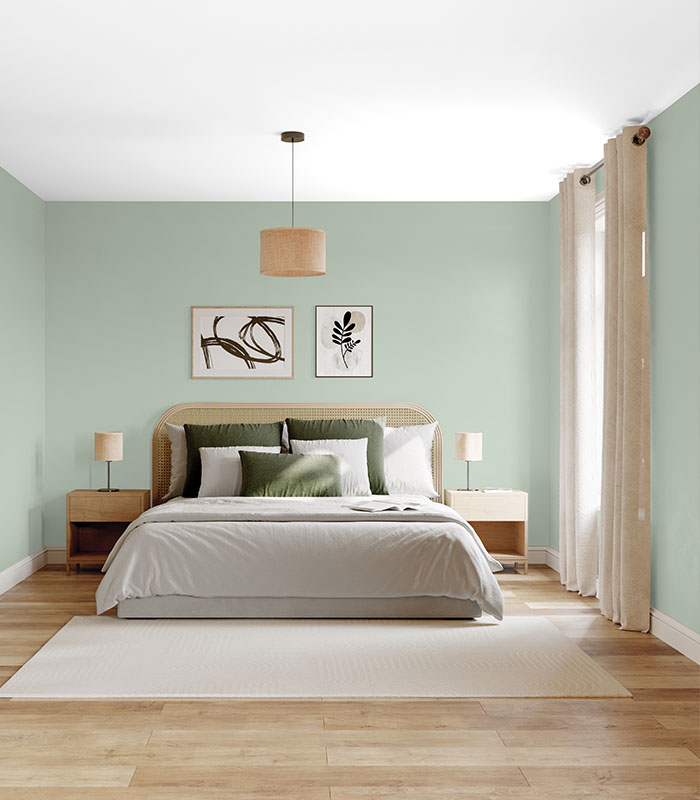Μια παλέτα εμπνευσμένη από τη φύση! Το πράσινο του φασκόμηλου στους τοίχους, φυσικά λινά υφάσματα και πινελιές σε πηλό ή τερακότα δημιουργούν ένα γήινο και αρμονικό περιβάλλον, ιδανικό για χαλάρωση.