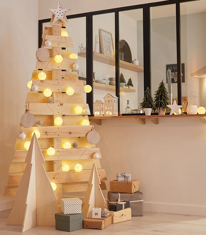 Πάρε ένα παλιό ξύλο ή κομμάτι παλέτας και στερέωσε πάνω του μια γιρλάντα με φωτάκια, στολίδια ή φυσικά υλικά, ώστε να φτιάξεις ένα χειροποίητο φωτεινό centerpiece, ιδανικό για τραπέζι, κονσόλα ή νησίδα κουζίνας.