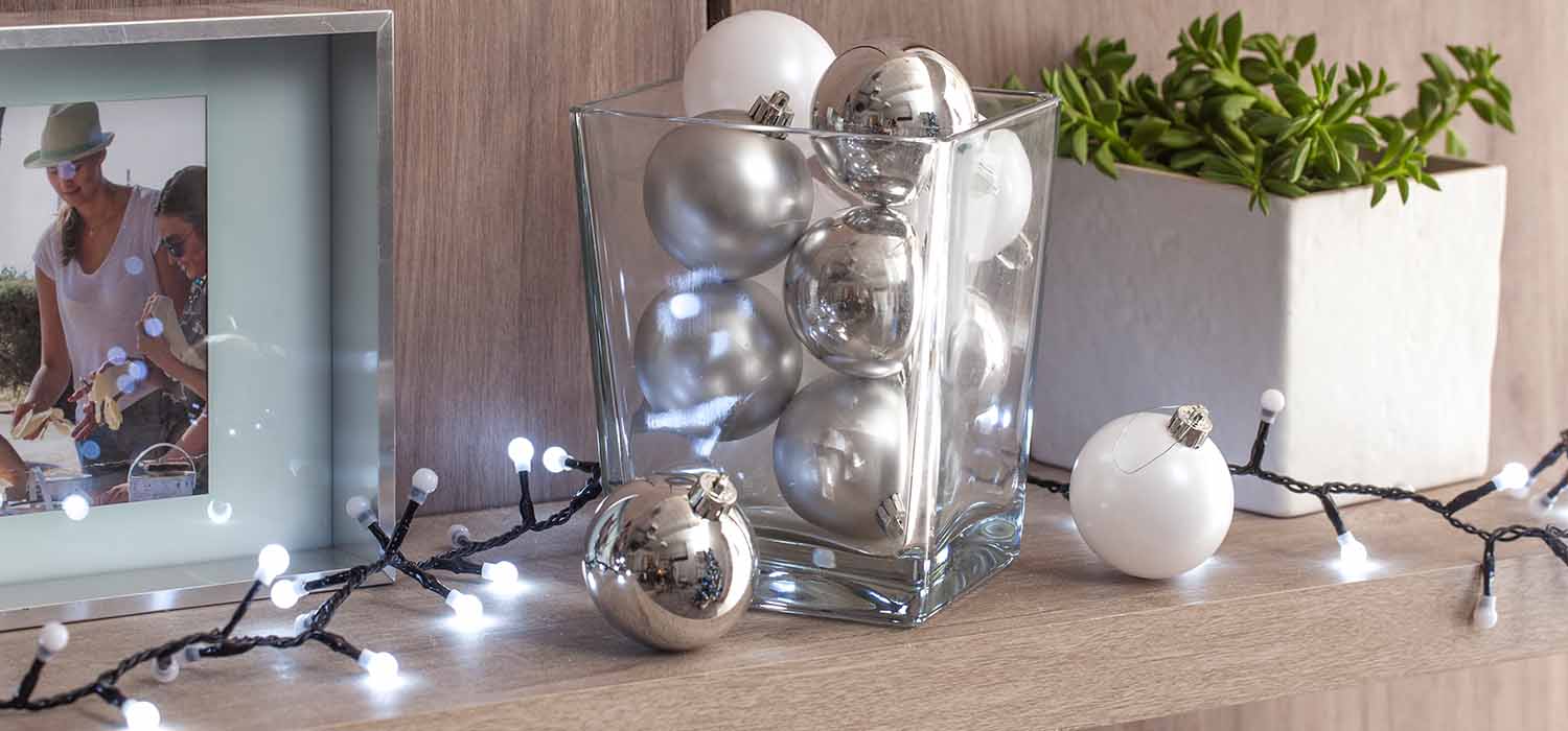 Γέμισε διάφανα βάζα ή ποτήρια με fairy lights, κουκουνάρια, ξυλαράκια κανέλας, αποξηραμένα πορτοκάλια ή μικρές μπάλες. Τοποθέτησέ τα σε τραπέζια, ράφια ή το τζάκι για φυσικό, rustic αποτέλεσμα.