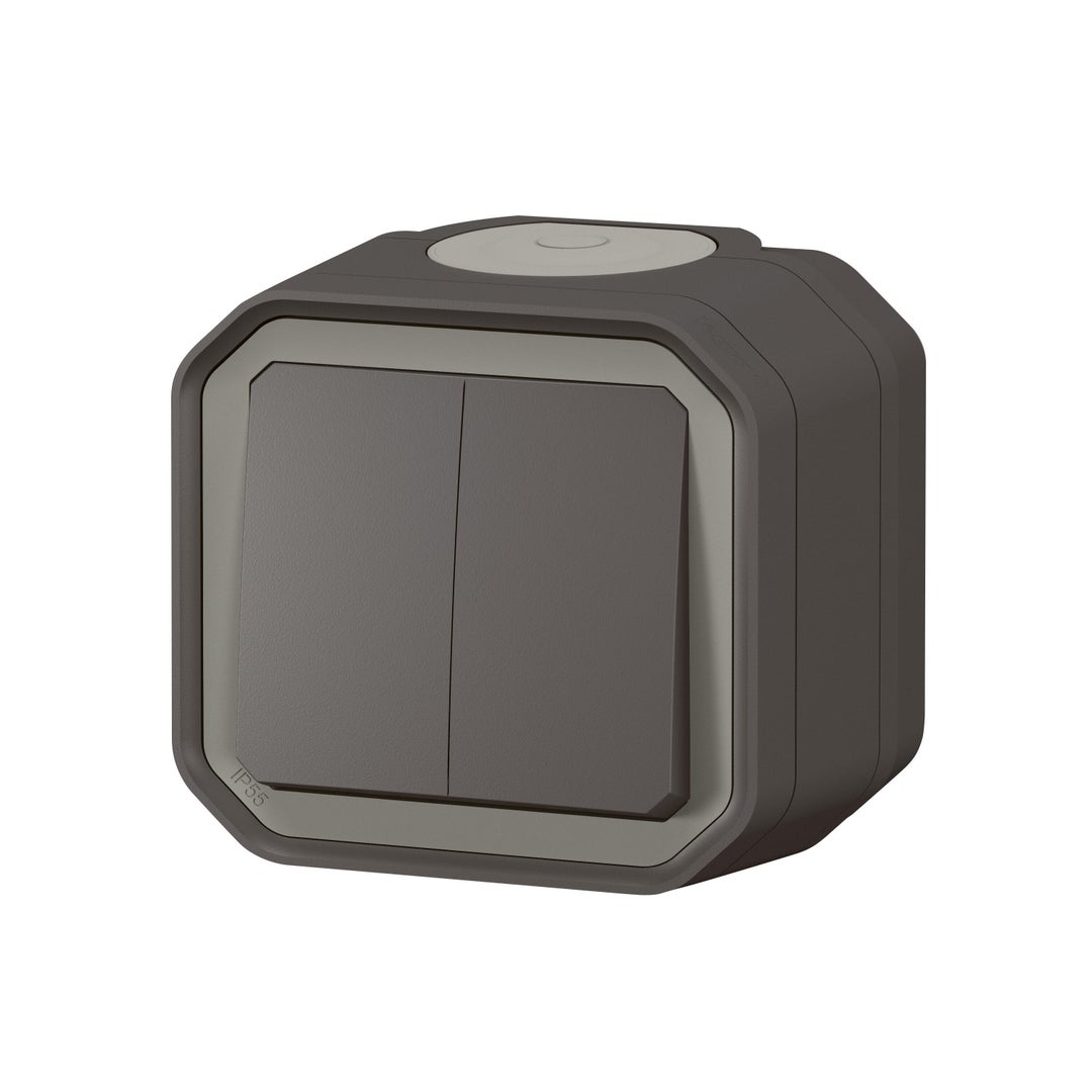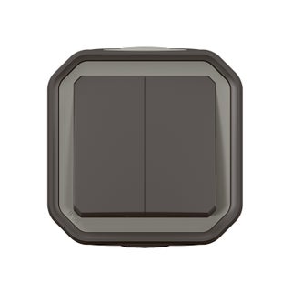 Διπλός διακόπτης ανοιχτού/κλειστού (on/off) και μπουτόν, επιτοίχιας εγκατάστασης, σε ανθρακί χρώμα. Για εύκολη διαχείριση πολλαπλών κυκλωμάτων.