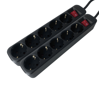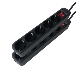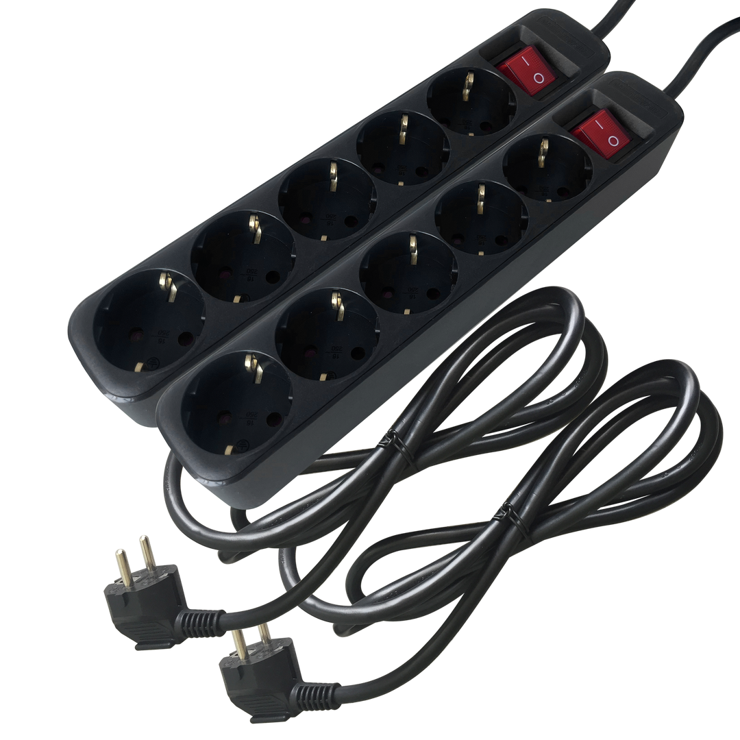 Σετ δύο πολύπριζων 5 θέσεων με διακόπτη και καλώδιο 1,5 μέτρου, σε μαύρη απόχρωση. Ασφαλής και πρακτική λύση για πολλαπλές συσκευές.