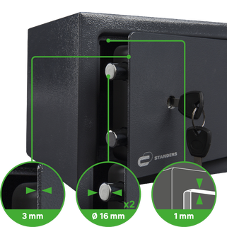 Χρηματοκιβώτιο ασφαλείας 9 λίτρων STANDERS από ατσάλι με κλειδί. Ιδανικό για αποθήκευση μικρών αντικειμένων όπως χαρτιά, προσωπικές αναμνήσεις, σκληρό δίσκο, έγγραφα καθώς και κοσμήματα. Το χρηματοκιβώτιο παραδίδεται με 2 κλειδιά ασφαλείας. Διαθέτει βασικό επίπεδο προστασίας από επιθέσεις. Παρέχεται αφαιρούμενο ράφι, προκειμένου να βελτιστοποιηθεί σύμφωνα με τις ανάγκες σας ο εσωτερικός αποθηκευτικός χώρος