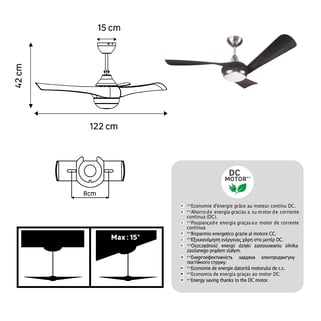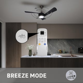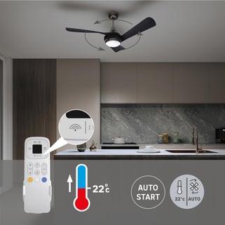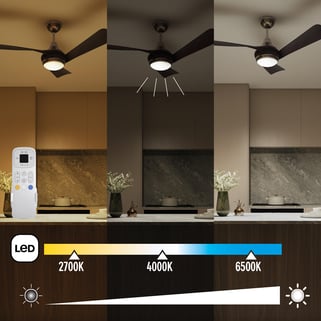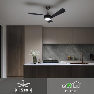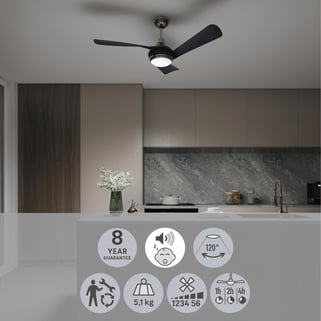 Αυτός ο ανεμιστήρας οροφής Inspire με 3 λεπίδες είναι ιδανικός για φωτισμό και για ψύξη του αέρα σε δωμάτια μεταξύ 13 και 20m². Χάρη στο συμπεριλαμβανόμενο τηλεχειριστήριο, μπορείτε να ρυθμίσετε την ένταση εξαερισμού μεταξύ 6 ταχύτητων και να προγραμματίσετε τον επιθυμητό χρόνο εξαερισμού (για 1H, 2H ή 4H). Χάρη στη λειτουργία "ifeel", μπορείτε να προγραμματίσετε μια συγκεκριμένη θερμοκρασία στην οποία θα ξεκινήσει αυτόματα ο ανεμιστήρας. Μπορείτε επίσης να επιλέξετε την ένταση φωτισμού και τη θερμοκρασία (2700K, 4000K και 6500K) των επιθυμιών και των αναγκών σας. Αυτό το προϊόν είναι πολύ ήσυχο σε χαμηλή ταχύτητα, ώστε να μπορείτε εύκολα να το τοποθετήσετε σε ένα υπνοδωμάτιο. Το Vadillo έχει μια αναστρέψιμη λειτουργία καλοκαιριού/χειμώνα που σας επιτρέπει να χρησιμοποιείτε τον ανεμιστήρα σας όλο το χρόνο: το καλοκαίρι, η κυκλοφορία του αέρα θα δροσίσει το δωμάτιό σας.